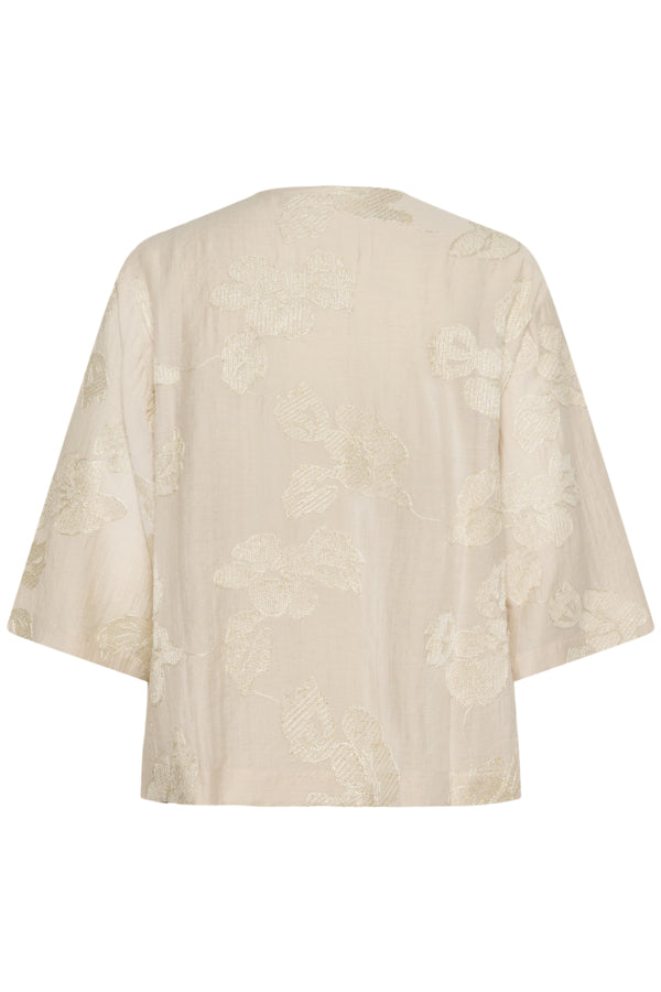 Kimono ouvert à la coupe droite et ample, manches larges longueur coude. Motifs floraux texturés visibles sur l’ensemble. Matière légère et légèrement transparente, longueur jusqu’à la hanche.
