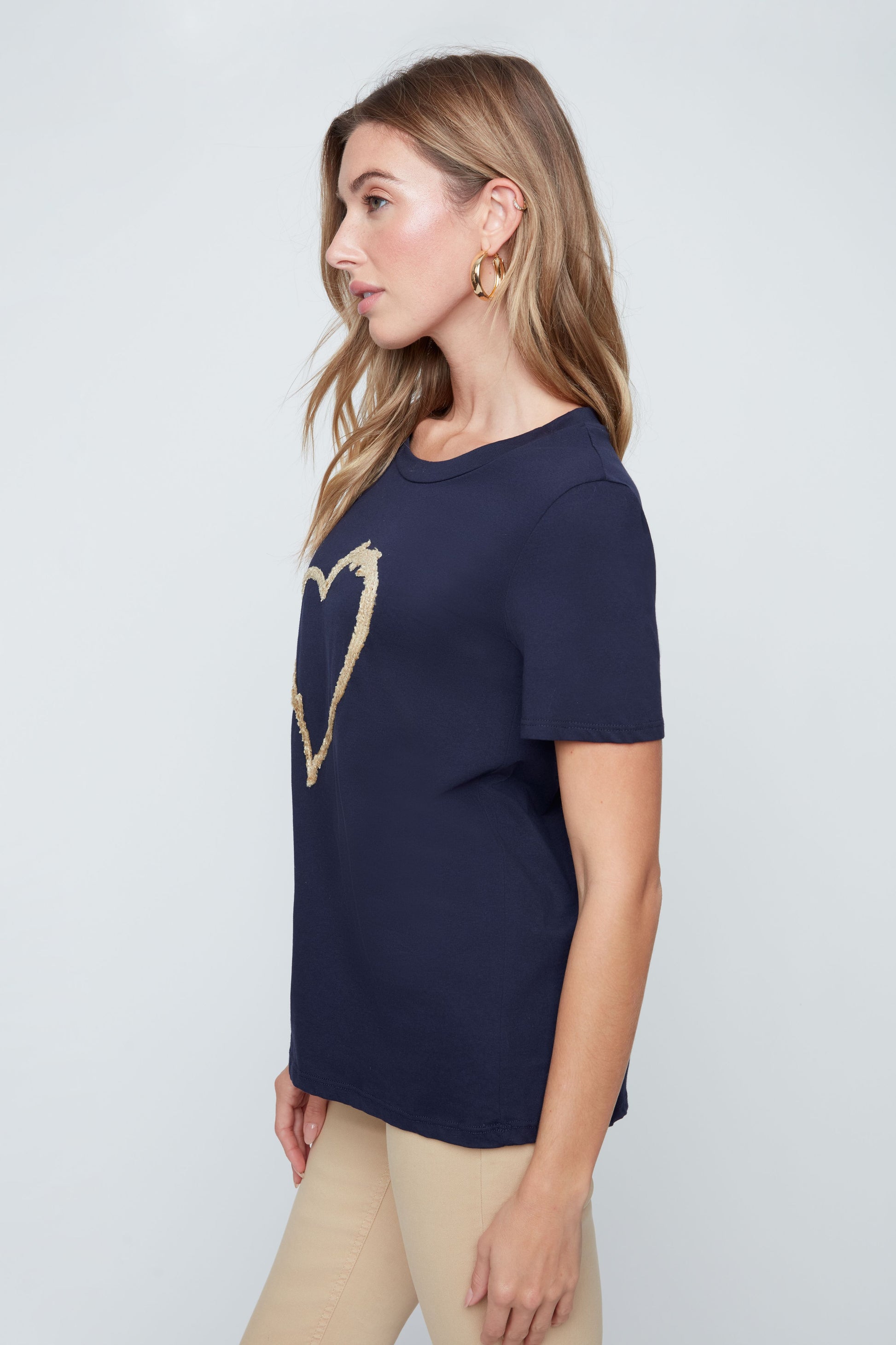 T-shirt à manches courtes de couleur bleu marine ou blanc, confectionné dans une matière douce et confortable. Il présente une coupe droite légèrement ajustée qui met la silhouette en valeur tout en offrant une grande aisance. Le devant est orné d’un grand motif cœur au style texturé dans une teinte dorée/beige ou bleu marin, apportant une touche lumineuse et féminine. Son encolure ronde classique en fait une pièce facile à porter au quotidien, parfaite à associer avec un pantalon clair ou un jean pour un look à la fois simple et élégant.